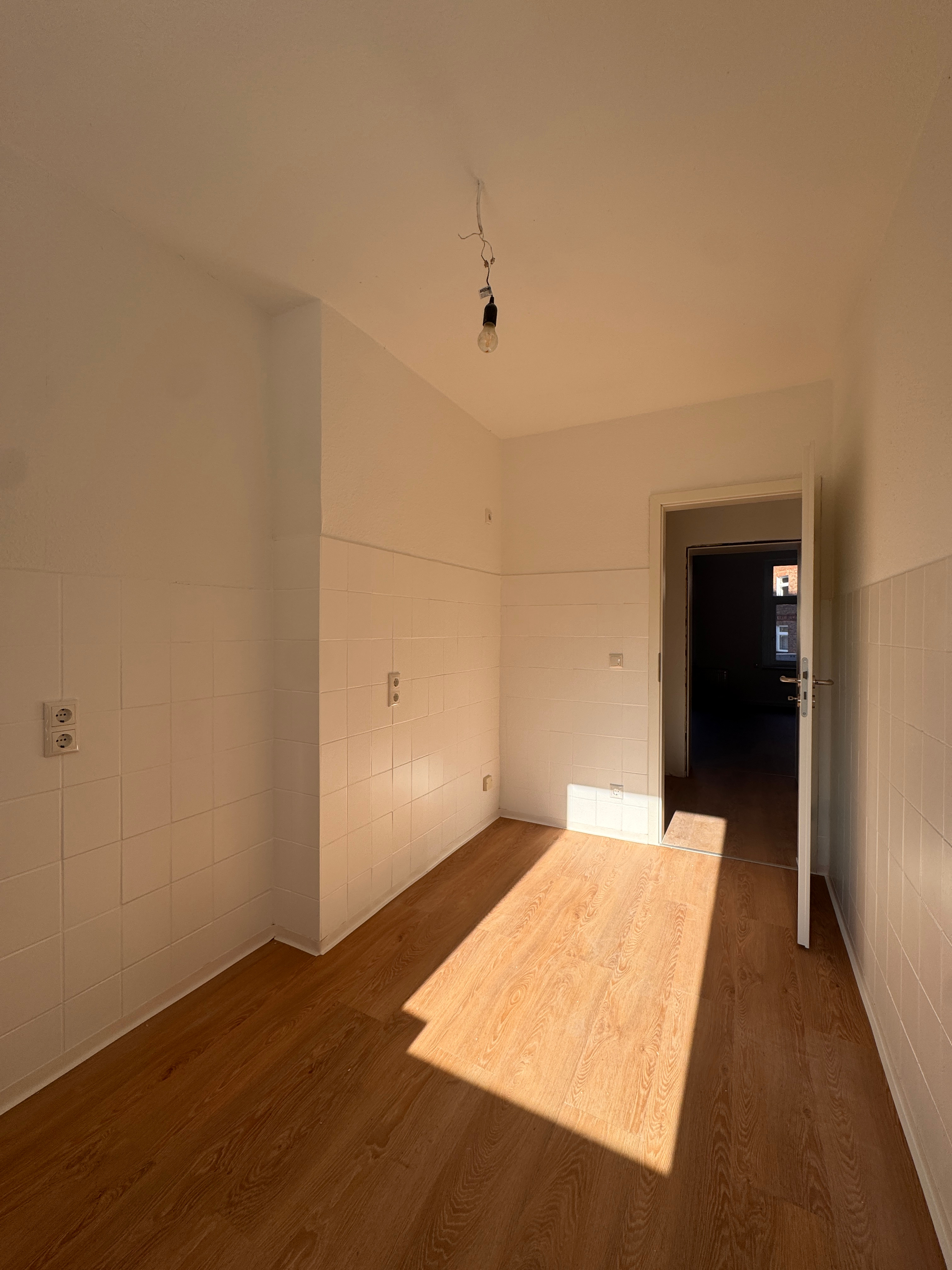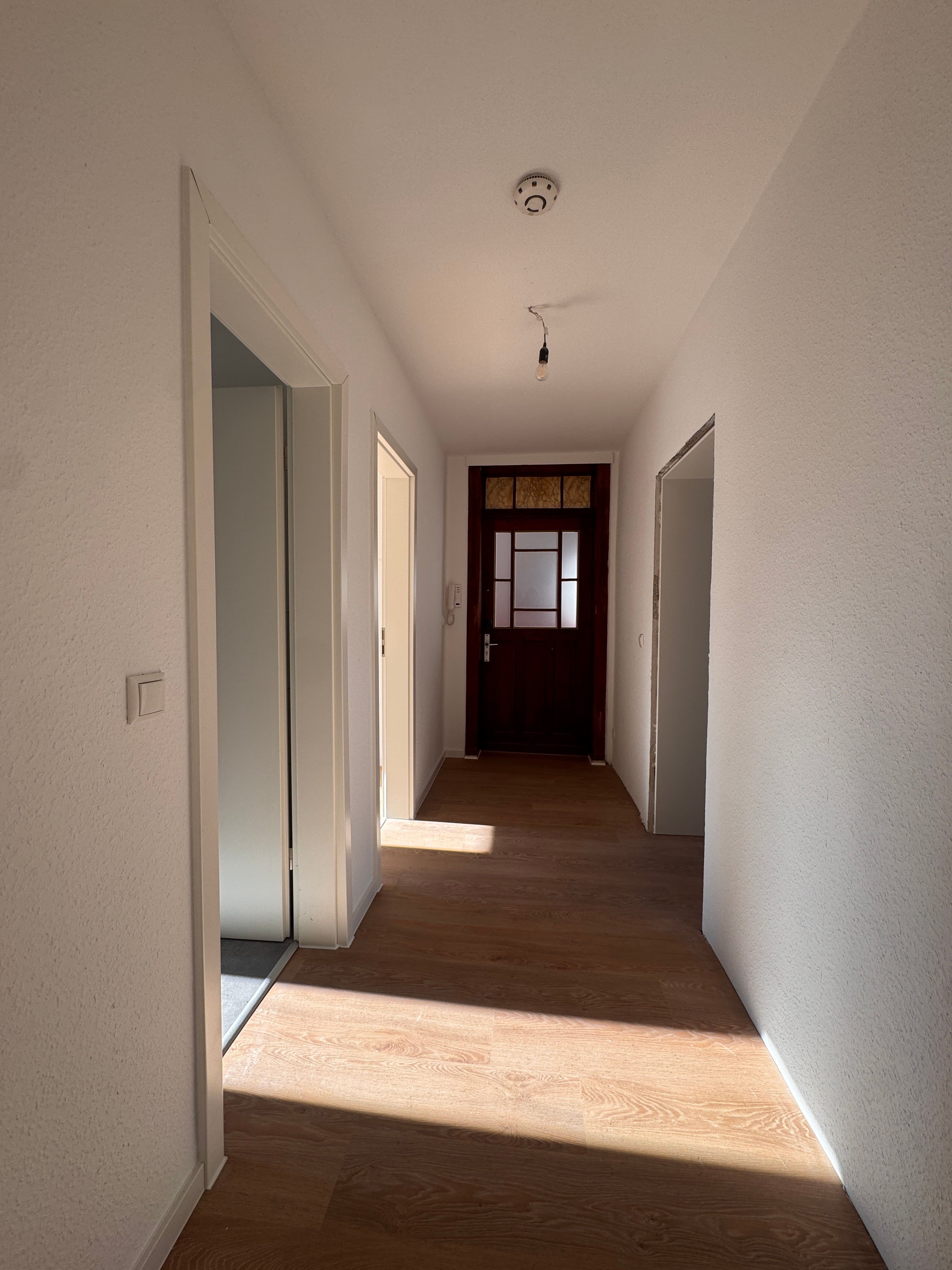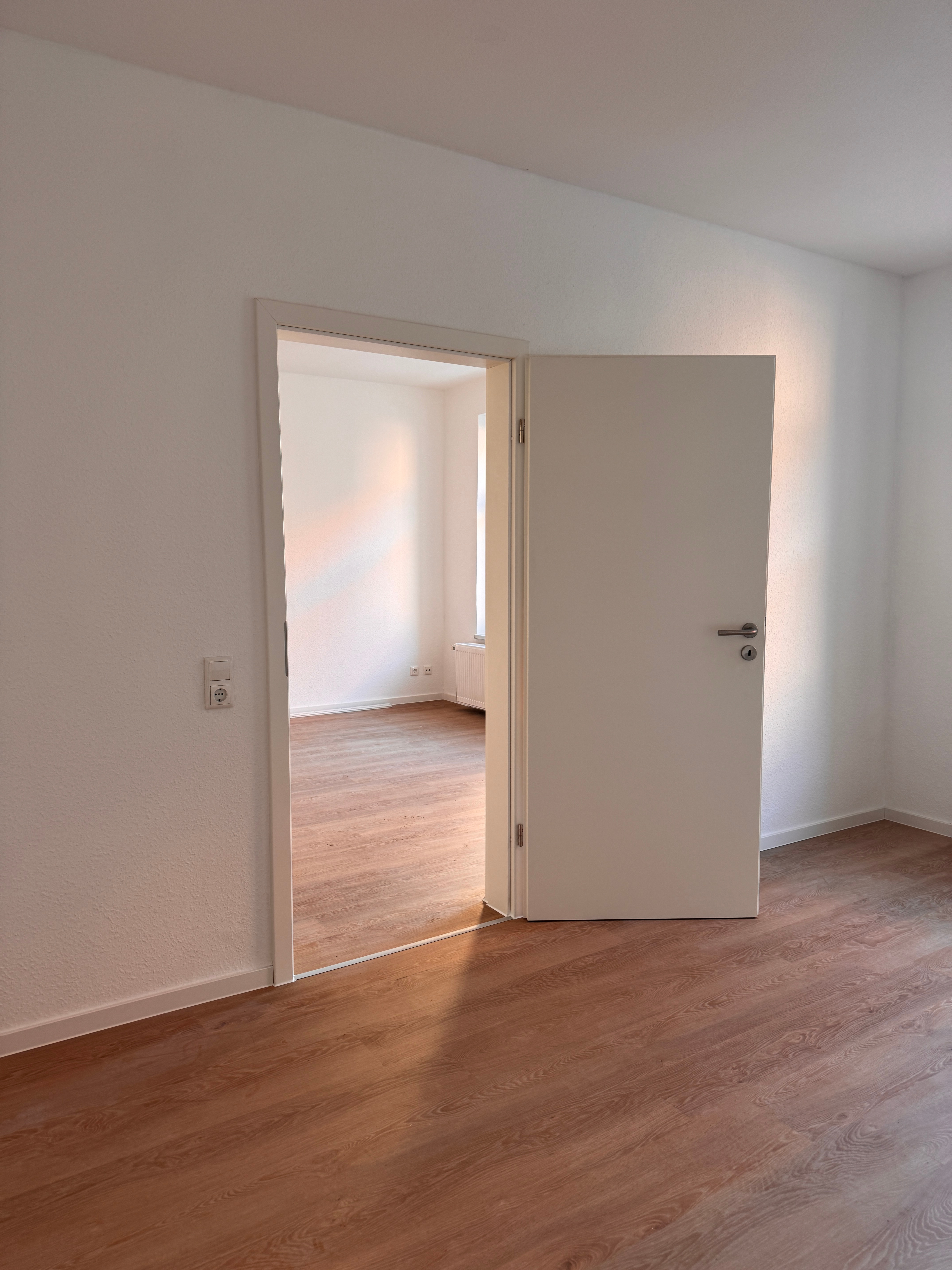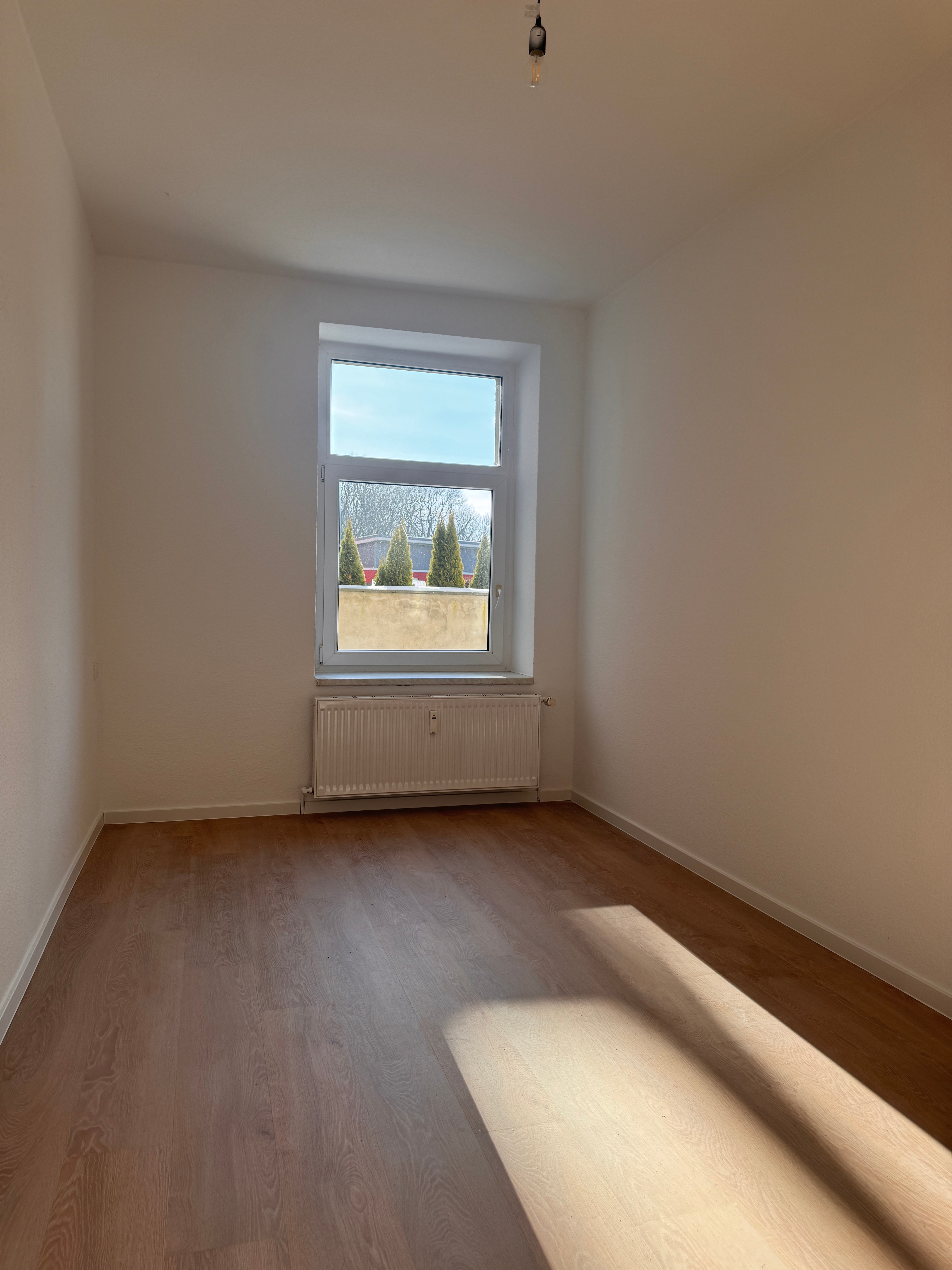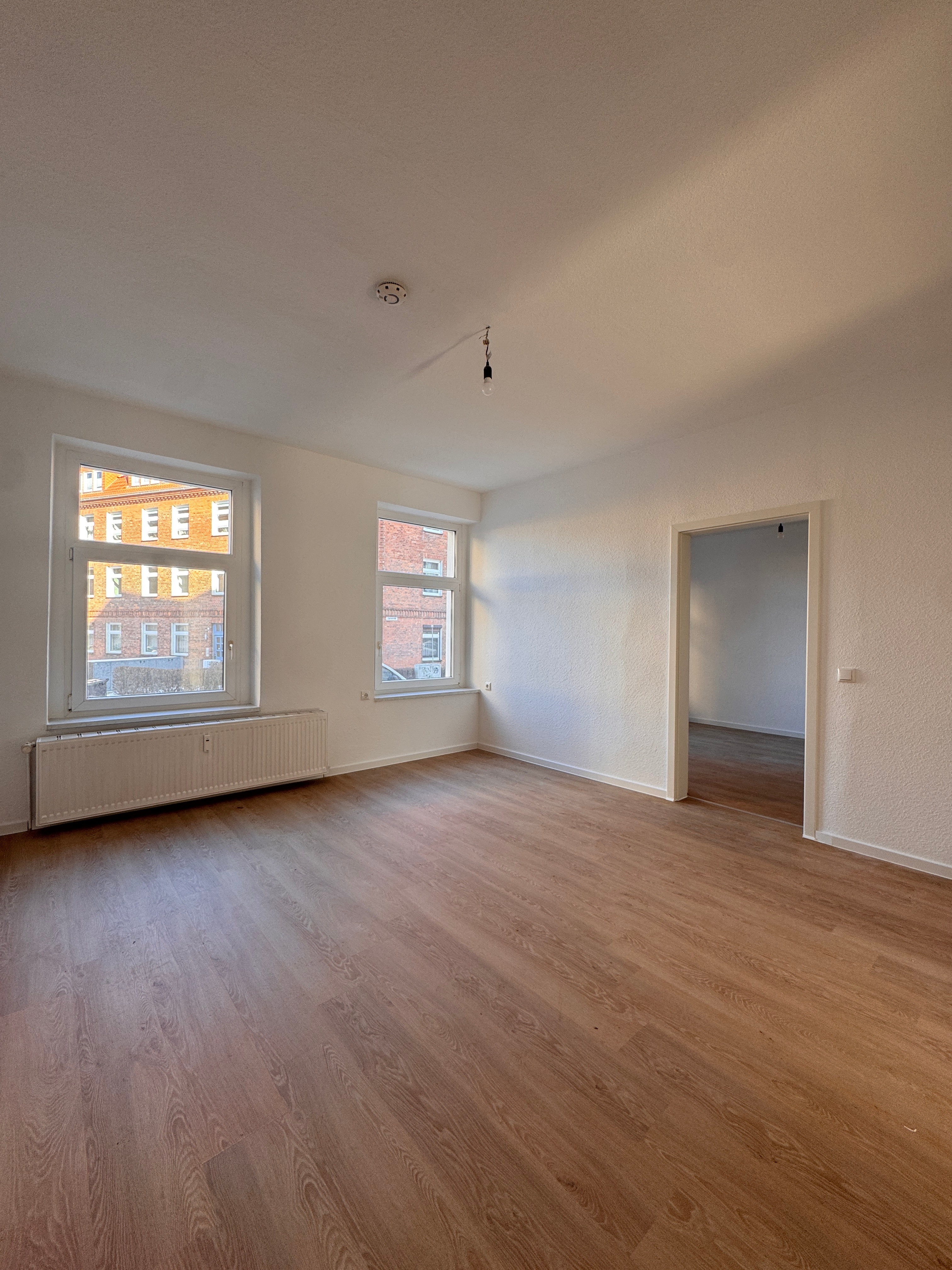 Das gut geschnittene Wohnzimmer überzeugt durch Helligkeit und eine angenehme Atmosphäre. Der neu verlegte Vinylboden unterstreicht den wohnlichen Charakter und schafft eine Verbindung aus Altbau-Charme und modernem Wohnkomfort. Vom Wohnzimmer gelangen Sie direkt ins angrenzende Schlafzimmer. Das dritte Zimmer eignet sich ideal als Kinder-, Arbeits- oder Gästezimmer.