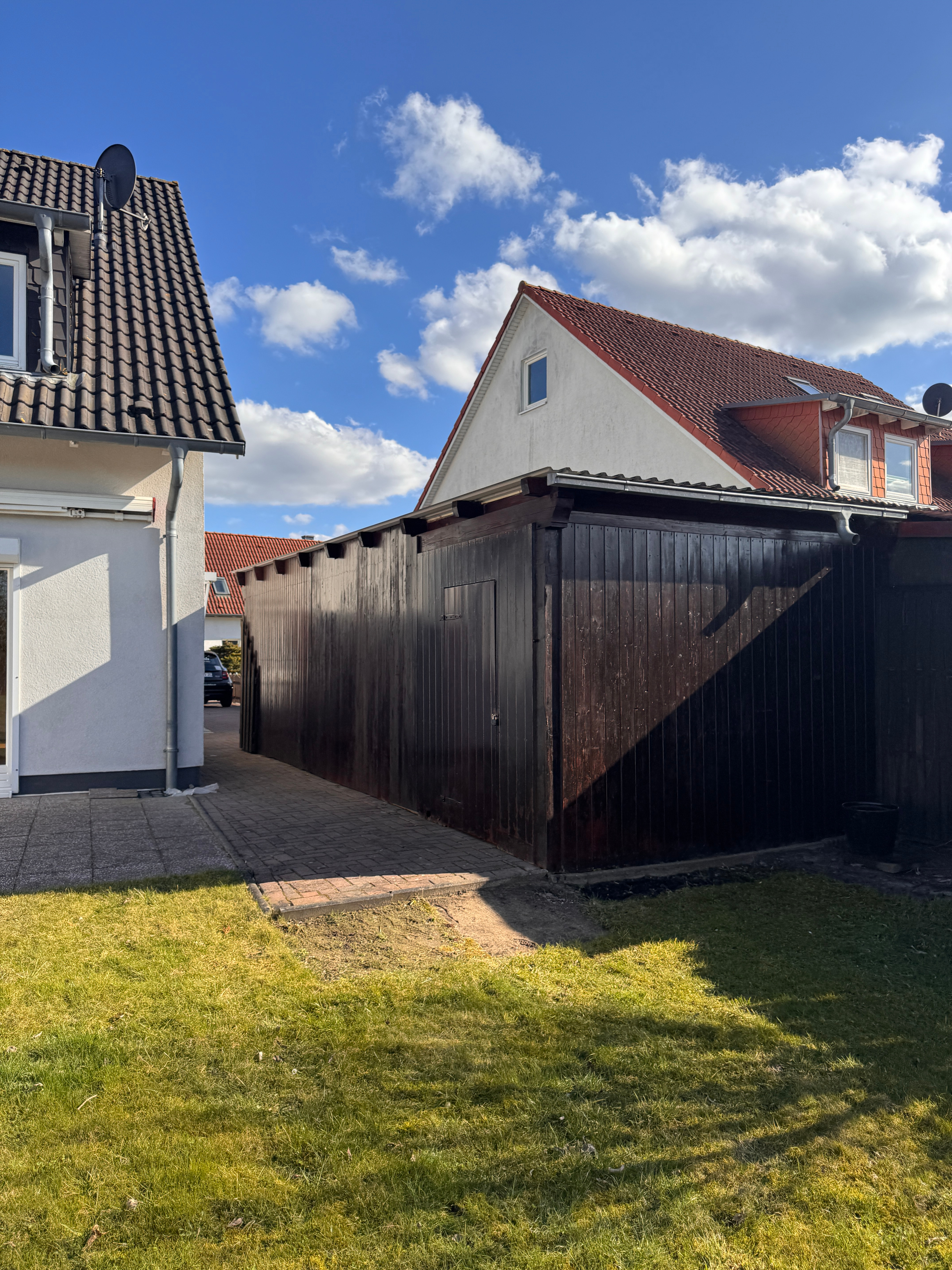 Das Grundstück verfügt über einen sonnigen Hofbereich, einen Vorgarten sowie einen Schuppen mit praktischem Stauraum. Ein Carport bietet Platz für ein Fahrzeug, davor stehen zusätzliche Stellflächen für mehrere Autos zur Verfügung. Der Hauseingang befindet sich seitlich am Gebäude.